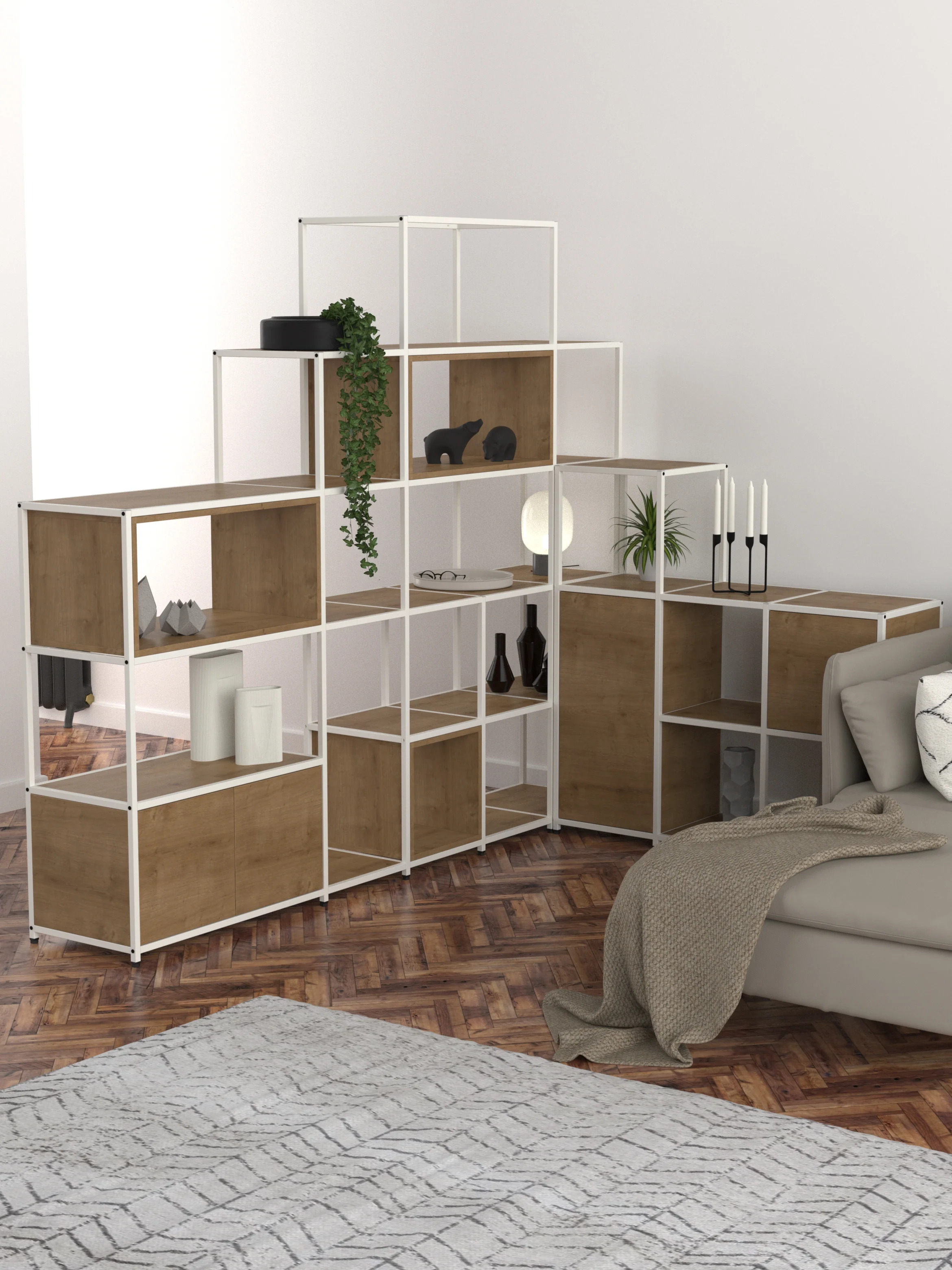 With its unique stepped design and thoughtful use of varied shelving shapes, the Aldro brings both style and functionality into any room. This corner unit features two double cupboards, and one smaller cupboard with adjustable shelves for concealed storage, alongside a mix of square and rectangular openings, perfect for decorative displays, books, or plants.
