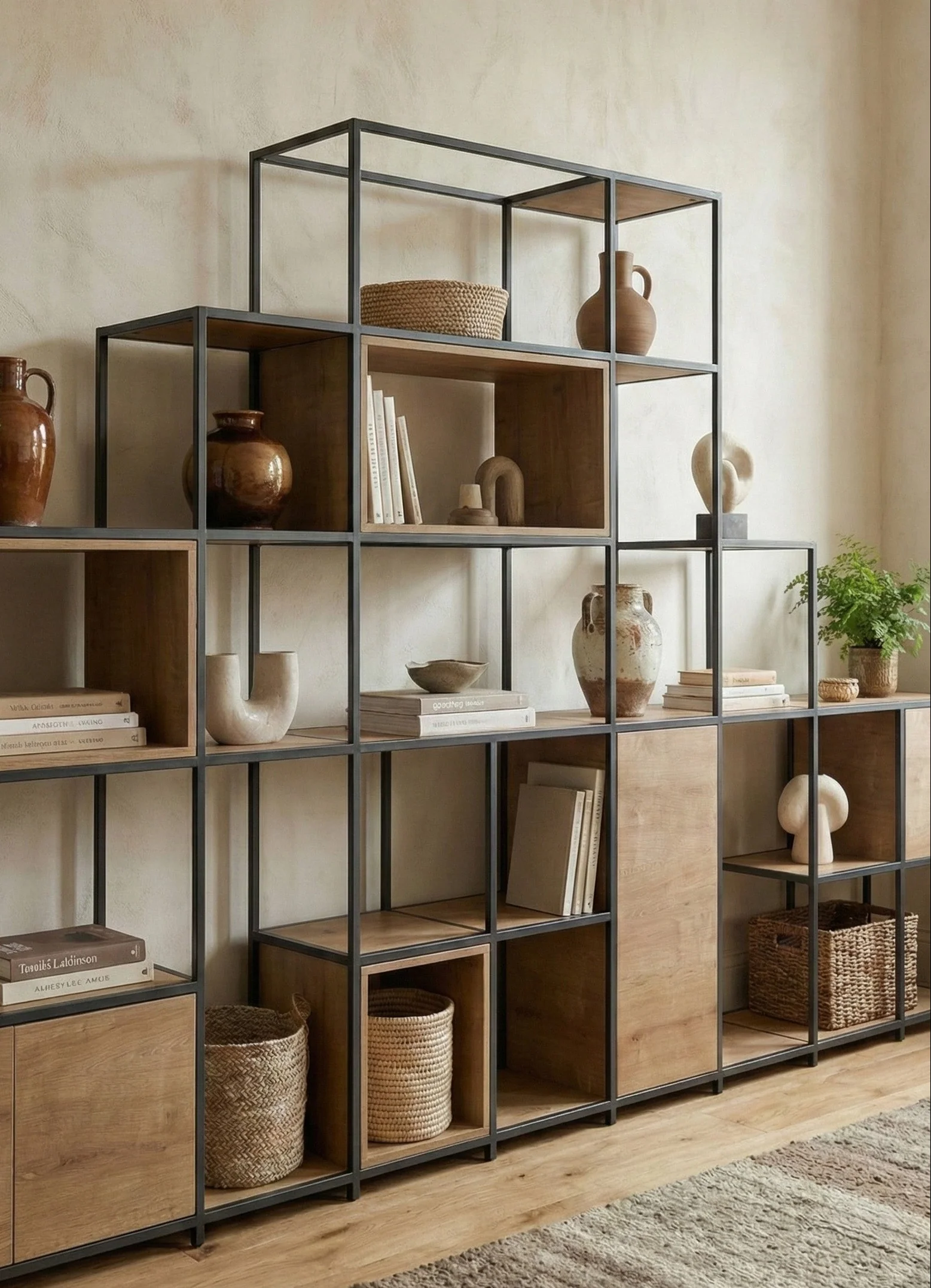 The Gillamoor uses our proprietary metal modular framework to give you a diverse range of storage options - nineteen open fixed shelves (eleven square, five horizontal rectangular, and three vertical rectangular) complete with one square cubby box and two rectangular cubby boxes.