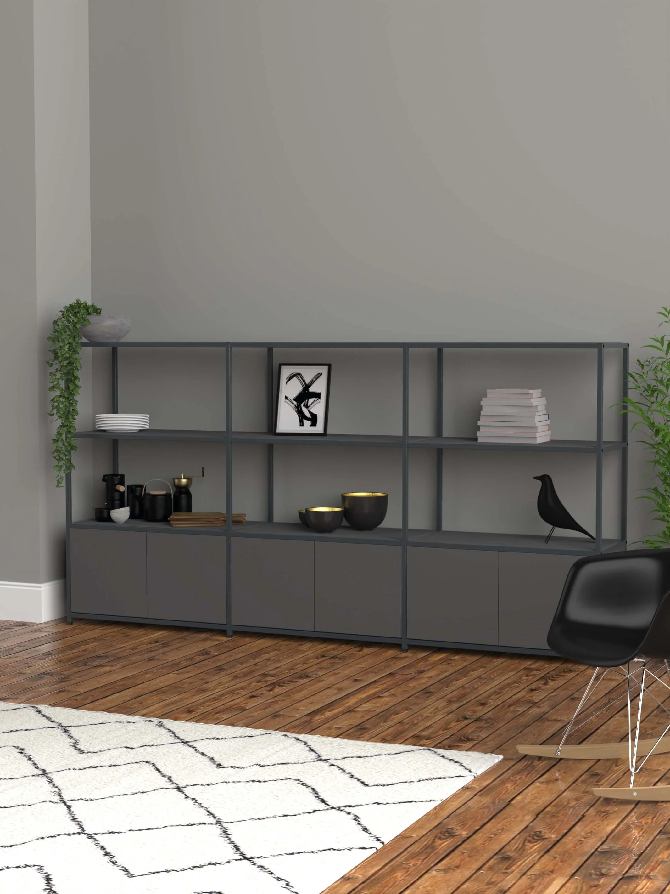 The unit is comprised of three levels (or four if you count the top). The top level and the middle level each feature three open rectangular shelves respectively, with openings measuring 38cm by 78cm each. Above that, you have the top surface which can also be used as a wide shelf. Then, on the bottom level, three double cupboards allow you to keep clutter out of sight. Each cupboard features adjustable shelving and cable management for optimising your storage space.