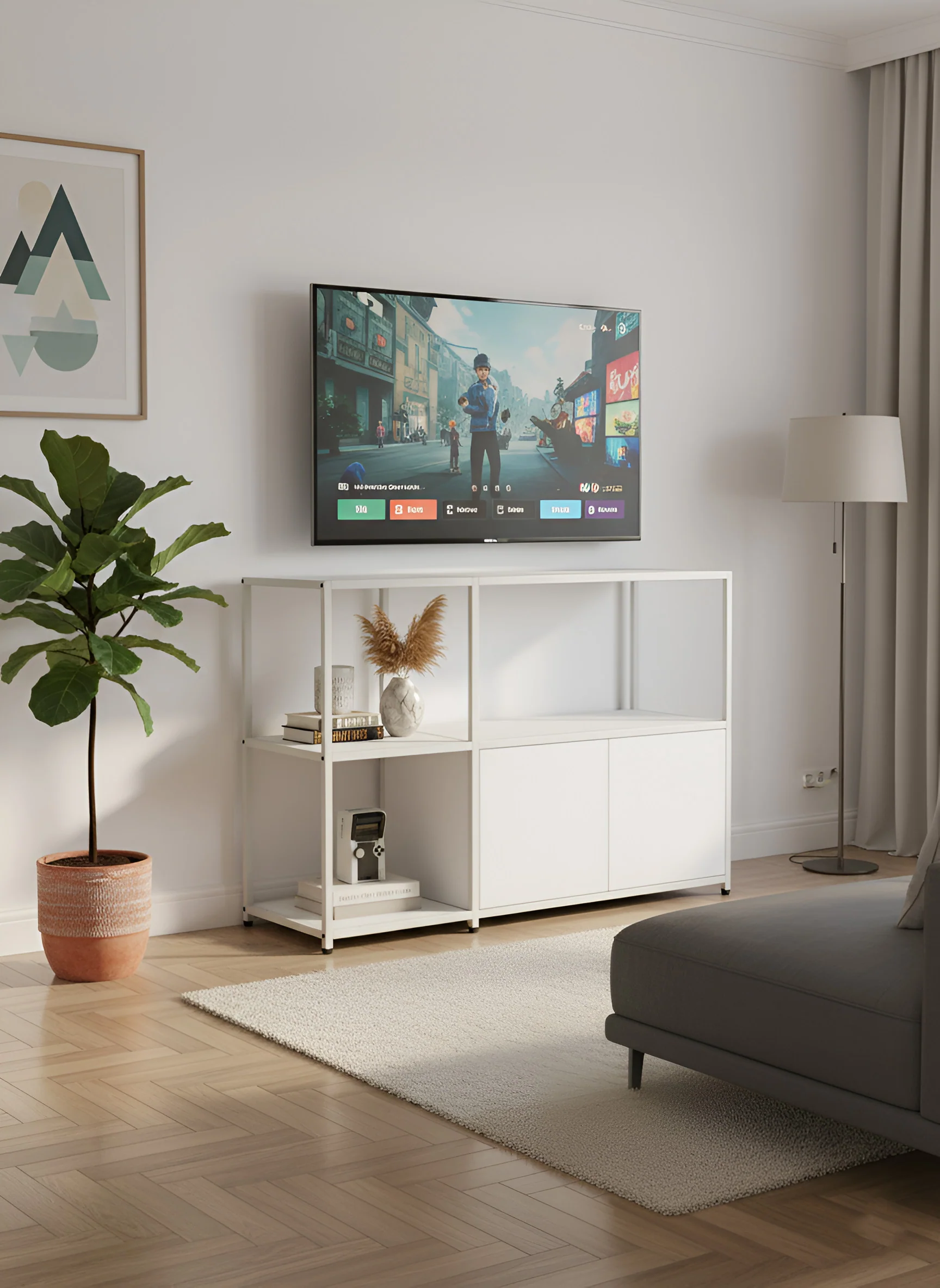 Store your TV and media devices in style with the Skirpenbeck Modular TV Stand. This grid-based TV unit features two levels of storage space, as well as providing you with a sturdy, attractive upper platform to place your television on.